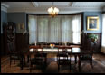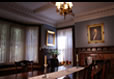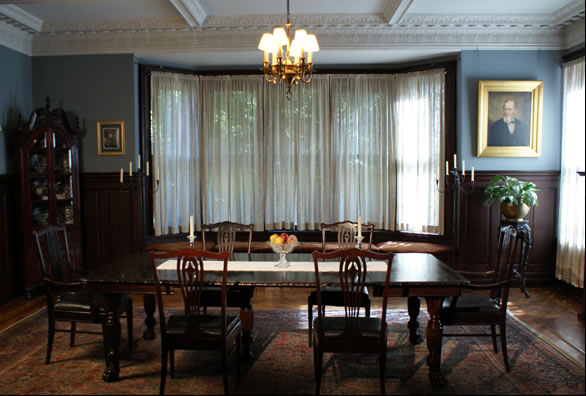 The dining room is furnished with pieces original to the Catlin and Archbald homes. The ornate mahogany dining table holds seven extensions to accommodate a large number of dinner guests. Beneath the beautiful bay window is a large, plush window seat. Above the Italian marble fronted fireplace hangs a portrait of George Catlin painted by Dunmore artist John Willard Raught in1907. |