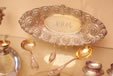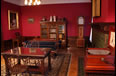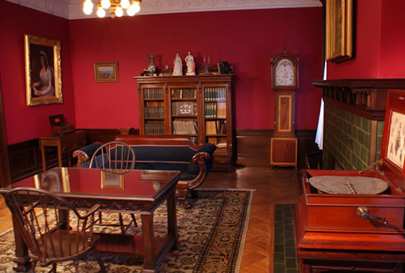 The library, also referred to as the sitting room or den, was used for informal occasions. Its woodwork is simple, and the fireplace is faced with glazed tile. A Victorian music box, Regina music box, and silver pieces from the Catlin/Archbald collection are among the treasures to be found in this room. |